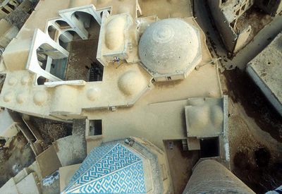 As Ibn Battuta’s long chronicle shows, such shrine centers were common throughout the Islamic lands. Many were centered on the tomb of a local sufi (mystic) saint. A prime example of the “little cities of God” constructed at the time of Ibn Battuta’s travels is the shrine at Natanz, twenty miles north of Isfahan on the slopes of the Karkaz Mountains in central Iran, built by an Ilkhanid vizier to commemorate the tomb of the Suhrawardi shaykh `Abd al-Samad [Map, p. 26; Fig. 2]. The complex incorporates a congregational mosque with the typical Iranian plan of four iwans and a domed chamber around a central courtyard, the mystic’s tomb surmounted by a pyramidal roof, a hospice for Sufis with a splendid tiled façade, and a soaring minaret. The somewhat higgledypiggledy arrangement of the buildings suggests that they had to be jammed into whatever land was available within the town.